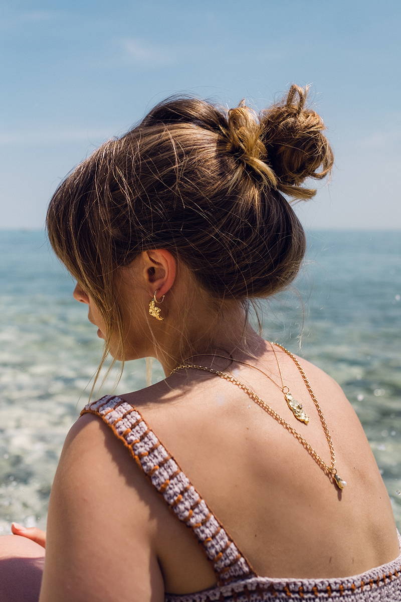 Accompanied by handcrafted vegan pearls, these stones nestle themselves into molten nuggets as a crustacean would seek refuge in a shell. This collection calls us to the shore, it speaks of the delicate balance of life under the waves and most importantly, it calls us to protect it.